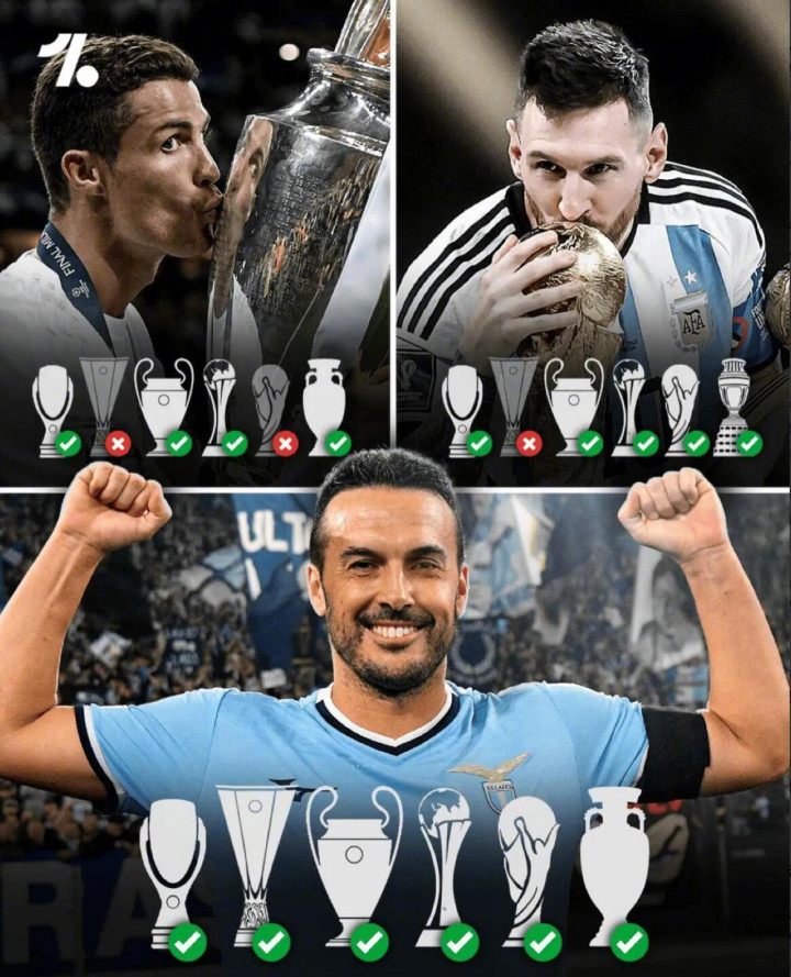 然而,就在大家热议梅西C罗的成就时,有一位38岁老将的荣誉被权威足球平台认证为足坛“全满贯”,那就是即将离开意甲拉齐奥的佩德罗。经权威足球数据平台“One Football”统计,他以独一无二的成就,傲然屹立于足坛历史——他是截至目前,唯一一位集欧冠冠军、欧联冠军、欧洲超级杯冠军、世俱杯冠军、欧洲杯冠军以及世界杯冠军于一身的球员。