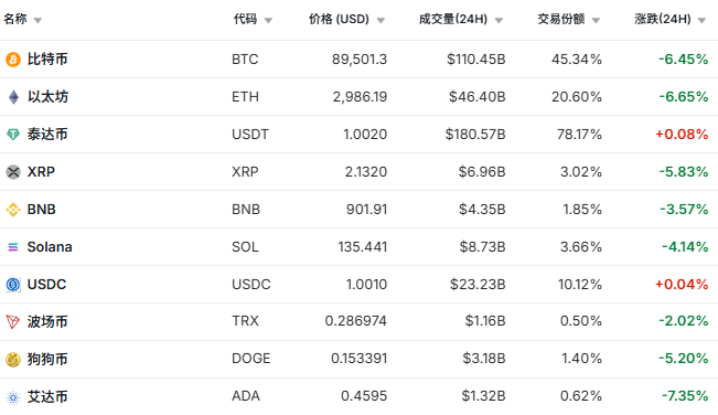 截至券商中国记者发稿时,比特币报8.95万美元,24小时内跌幅为6.45%;以太坊下跌6.65%,报2986美元;艾达币跌超7%,XRP跌近6%,Solana跌超4%,BNB跌超3%。