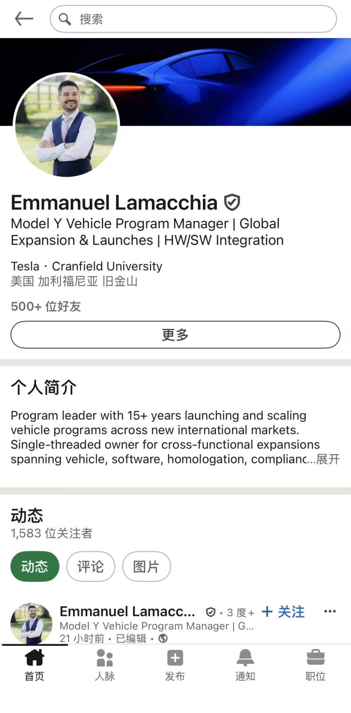 就在特斯拉Cybertruck项目负责人宣布离职的当天晚些时候,特斯拉ModelYSUV的项目经理EmmanuelLamacchia也在领英上宣布在公司工作八年后离职。