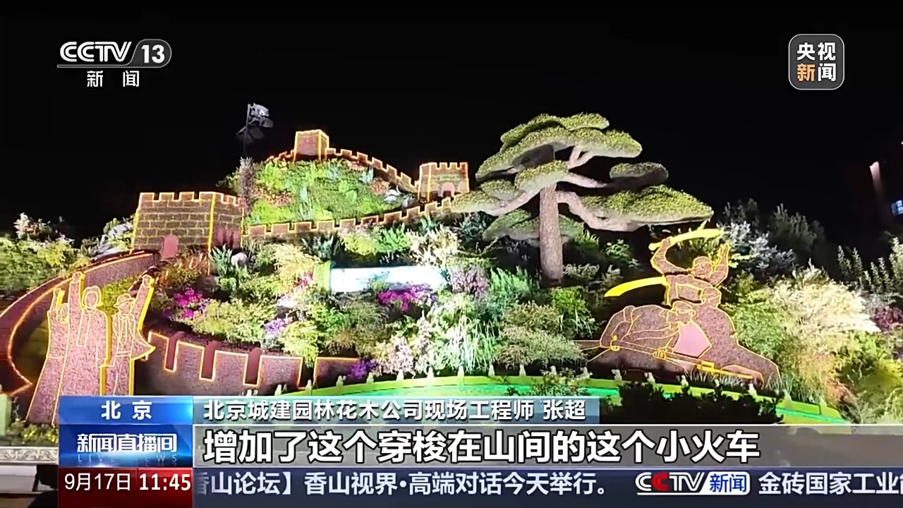 北京城建园林花木公司现场工程师 张超:在此次这个施工过程中,我们将会有67个新优品种和乡土植物在长安街花坛当中首次亮相。从纪念活动到国庆,花卉布置是有机衔接的,对元素进行更换,景观进行调整,比如说黄河赞歌花坛调整了之前的《黄河大合唱》的音乐,更换为《我和我的祖国》,锦绣山河花坛,增加了穿梭在山间的这个小火车。