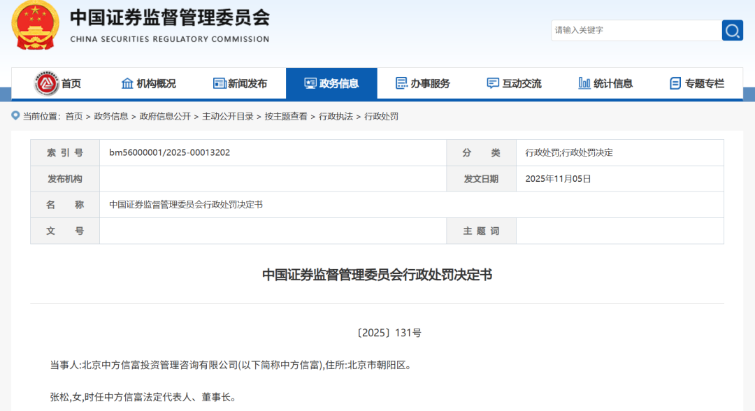 11月14日,证监会官网公布的行政处罚决定书显示,北京中方信富投资管理咨询有限公司(以下简称中方信富)被证监会处以300万元罚款,并撤销证券投资咨询业务许可。同时,中方信富的时任法定代表人、董事长张松被给予警告,并处以60万元罚款。