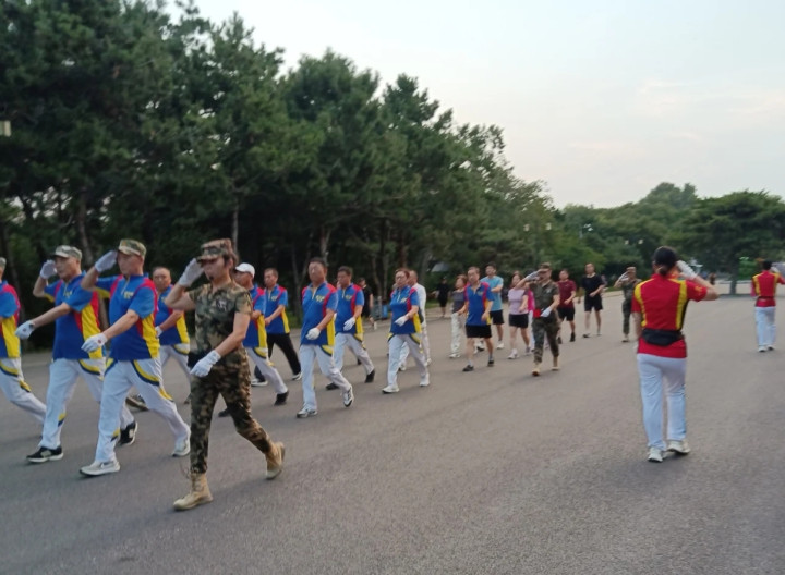 招呼落下,一首流行音乐《朋友的酒》响起,上百人齐刷刷动了起来。“人生几十年,总会有风雨来陪,潇潇洒洒赴会,今不醉不归……”伴着豪放的旋律,队员们逐渐放开手脚,浩浩荡荡向前迈步。